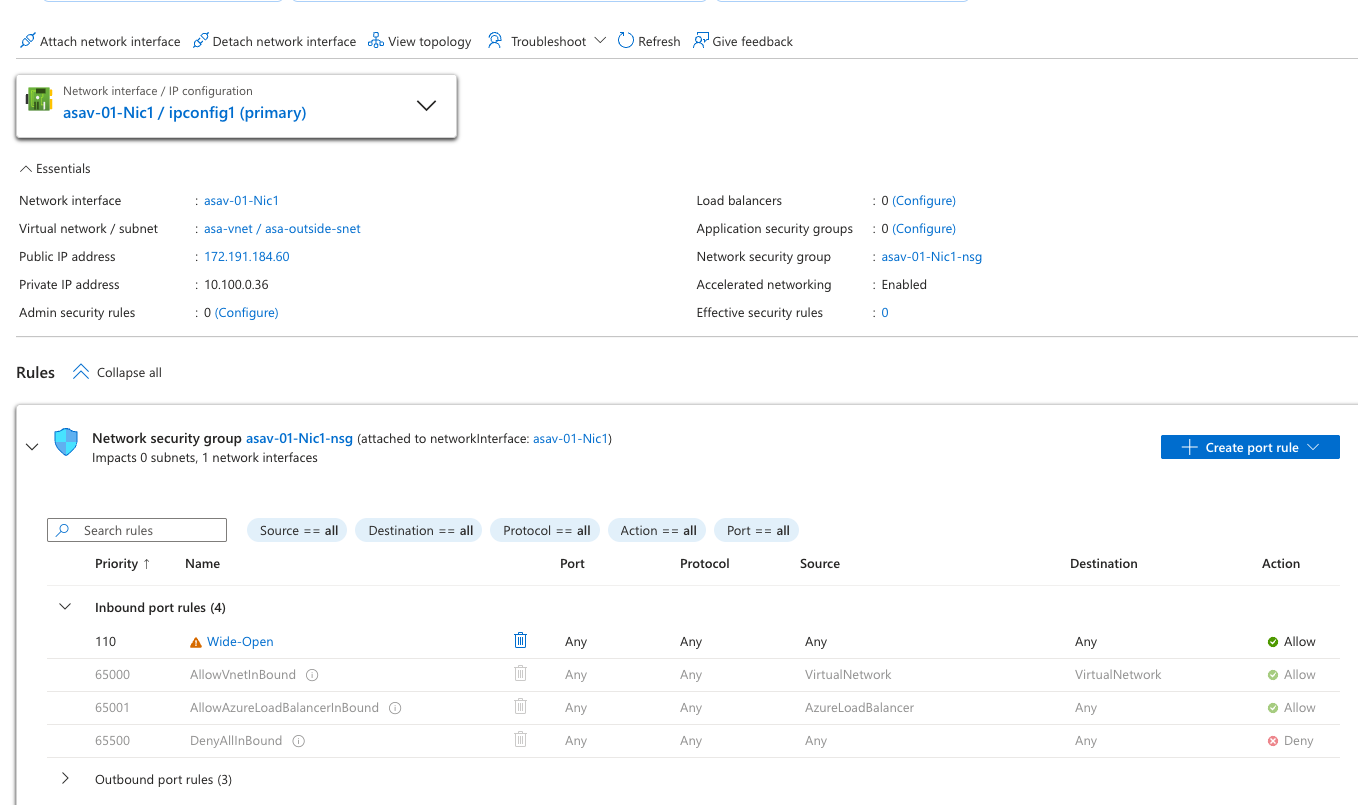 Here’s how I’ve got the ASAv’s outside interface configured. Wide open NSG along with a public IP that will serve as the tunnel endpoint later.