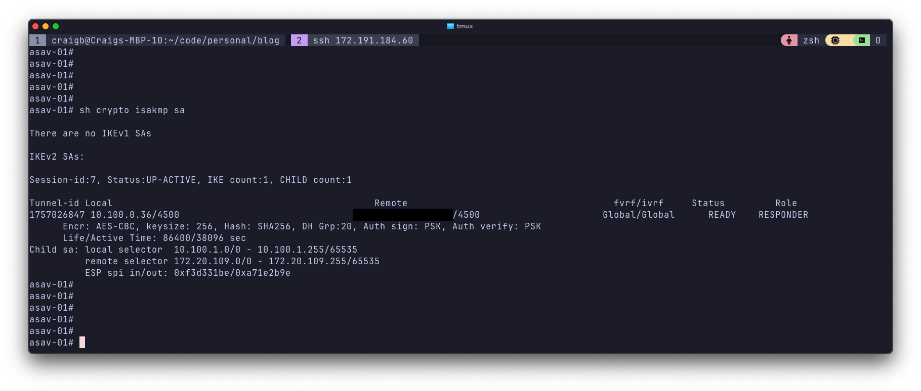 In this short series, I deployed an ASAv inside of Azure in order to terminate site-to-site VPN tunnels, rather than using the native Azure VPN gateway option. This lets me monitor and troubleshoot tunnels with more familiarity and visibility than I’ve been able to get with Azure itself.
