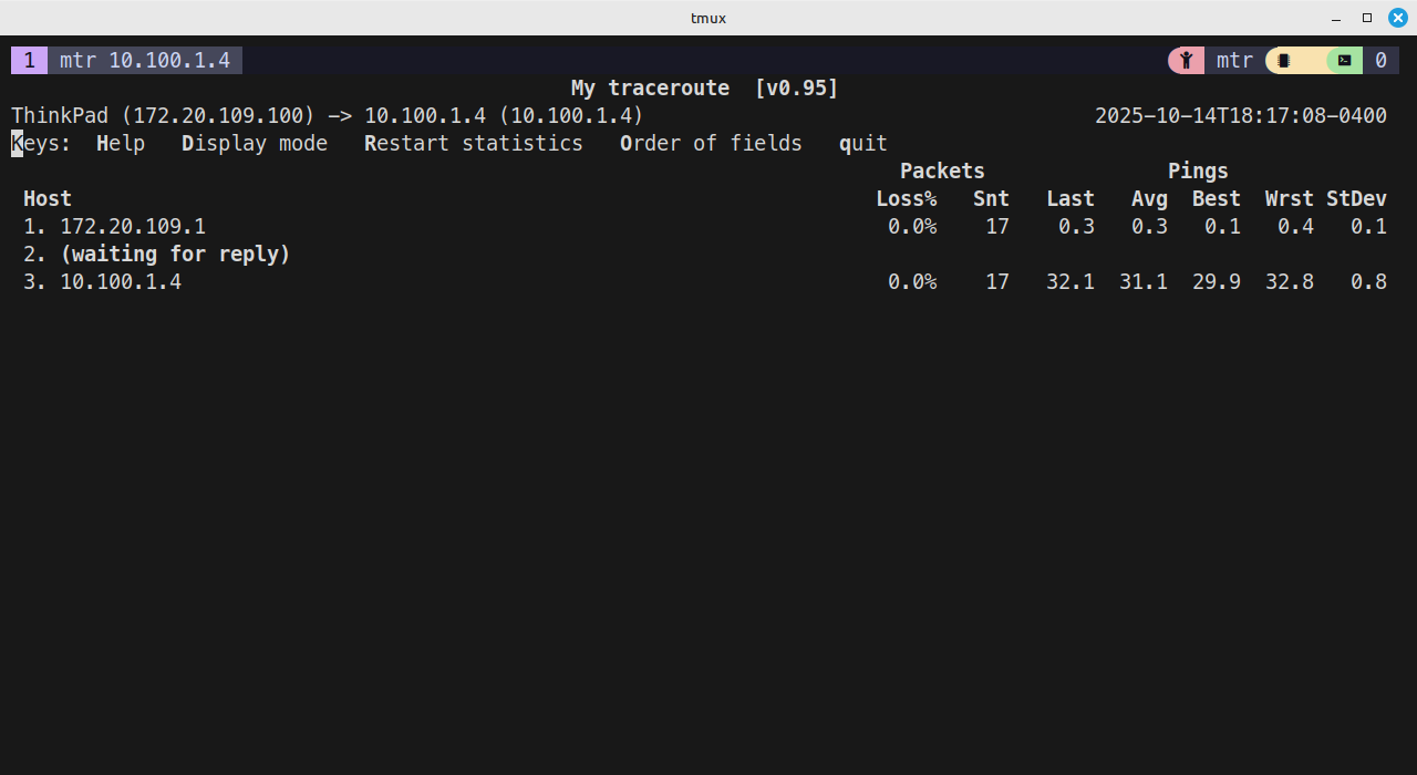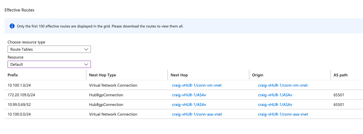 My test tunnel was built as a route-based VPN. On the Azure side, I created a static route to the subnet behind the test branch, and then redistributed that into the BGP process which is peered with an Azure vHub. That allowed the branch LAN prefix to propogate all the way into my Azure routing table, and the traceroute confirms bi-directional traffic between my local test client (172.20.109.100) and my Azure test VM at 10.100.1.4.