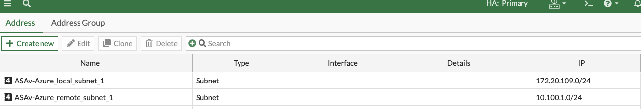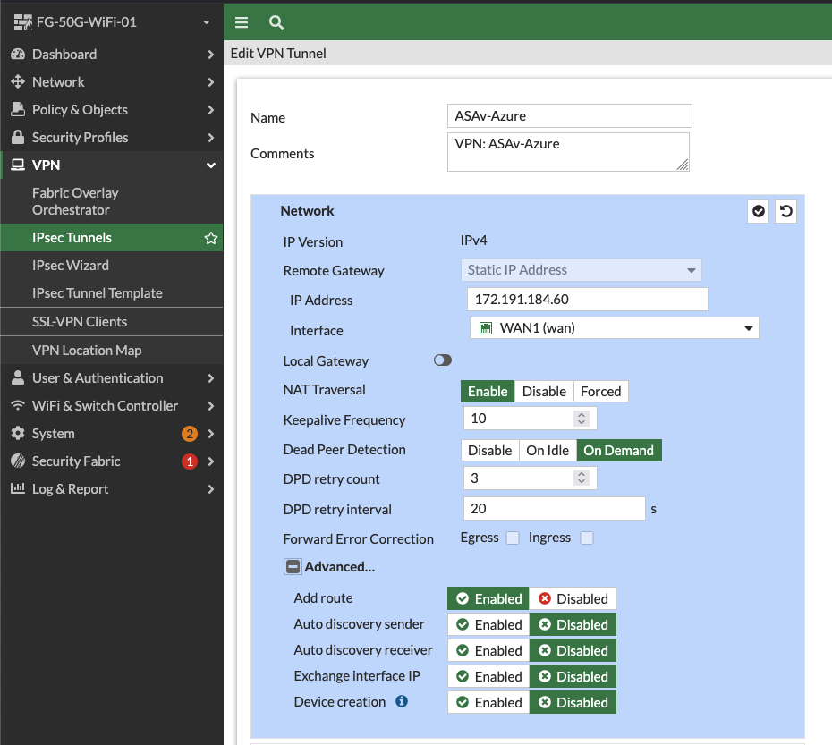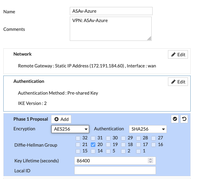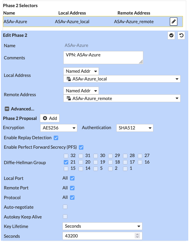 The Local and Remote Addresses are address objects I’ve defined which refer to the LAN behind the Fortigate and a subnet with my test VM in Azure, respectively.