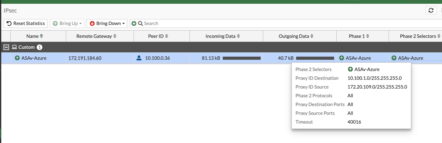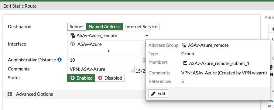 Next up I added a static route on the Fortigate towards an address group containing that same 10.100.1.0/24 prefix where my test VM in Azure lives. The interface used is the Tunnel interface I was just working with.