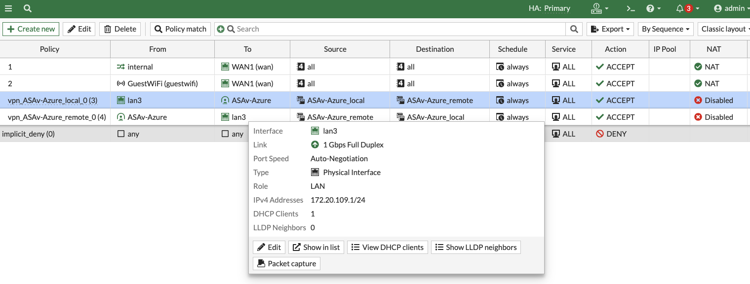 And finally, I added firewall policy to permit bi-dreictional traffic between the Fortigate LAN subnet and the Azure subnet.