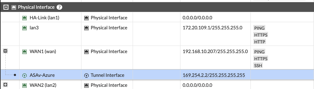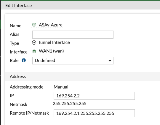 Upon creating that VPN config, the Fortigate creates a Tunnel Interface underneath the WAN interface that it was tied to. In my case, this is WAN1. It will initially have no addressing assigned, so I gave it an APIPA /30, the other address of which will be used on the ASAv tunnel1